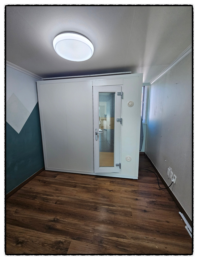 안녕하세요 사운드블럭입니다. 제품명 : 스탠다드 사이즈 : 2200*1300(내부사이즈 2060*1130) 추가옵션 : 이동식에어컨, 환풍기 추가 사용용도 : 수면 설치지역 : 대전